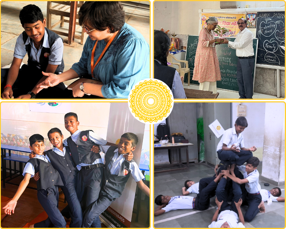The Mission Lehar pilot project, initiated in three schools, integrates sound, prayer, and theatre into education to instill acceptance and harmonious learning in children. With workshops for orienting teachers, maulies and volunteers and sessions of well-trained maulies facilitating the sessions, we garnered the trust of the children and school staff alike in no time. This initiative is founded on Bodhmarga’s vision of Sahajoddhaar, emphasizinginner peace leading to world peace. We seek to bring the positive impact of sound tracks to underprivileged communities, enhancing their quality of living, learning, and being while providing those on the spiritual path, a way to make difference in the society and apply the easeful conscious philosophy of Bodhmarga in a way which allows all to be uplifted. The project aims to nurture peace in young minds, equipping them to face the outer world with enhanced self-awareness, interpersonal harmony, self-leadership, and resilient self-esteem. By providing mental and emotional stability through the compassionate presence of a Mauli, we create an environment where children can grow and learn in peace.